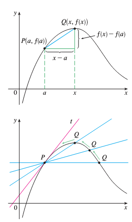 Si tenemos una curva con ecuación y queremos hallar la recta tangente en el punto , consideramos un punto cercano donde .