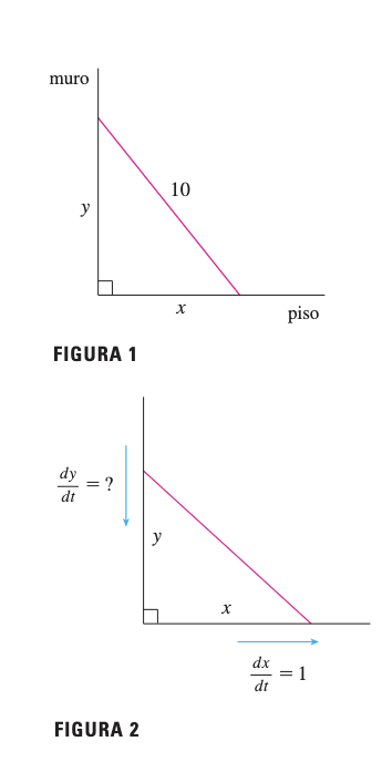 Una escalera de 10 pies de largo está apoyada contra un muro vertical. Si la parte inferior se desliza alejándose de la pared a razón de 1 pie/s, ¿qué tan rápido resbala hacia abajo por la pared la parte superior cuando la parte inferior está a 6 pies del muro?
